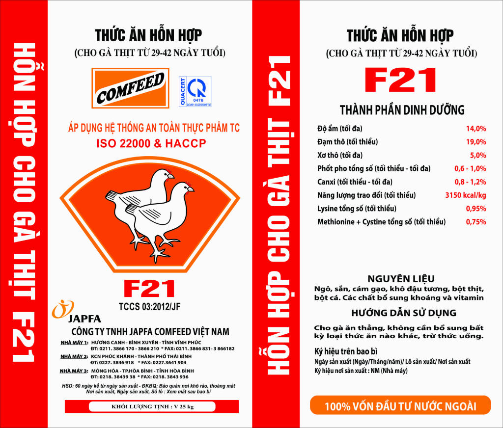 Corn, tapioca, rice bran, soybean meal, meat meal, fish meal, premix and vitamin