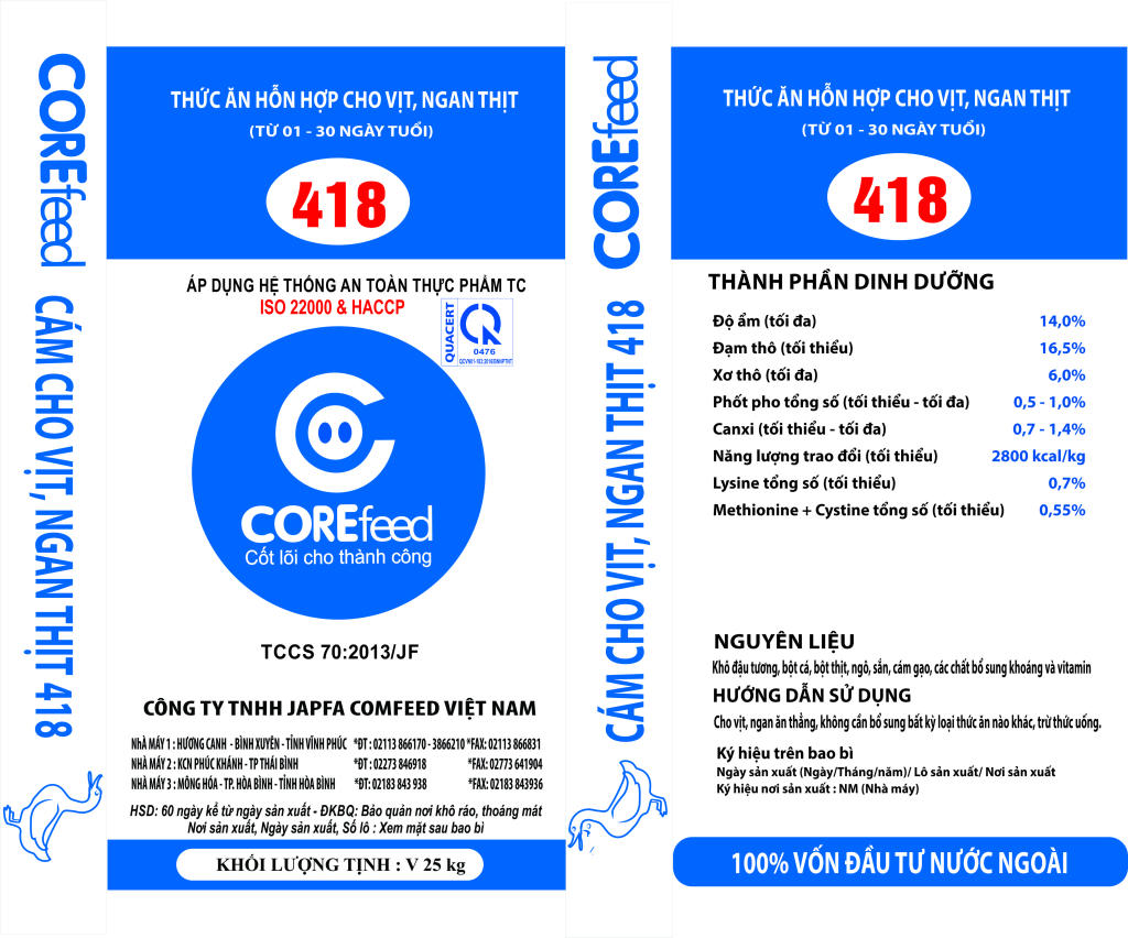 Corn, tapioca, rice bran, soybean meal, meat meal, fish meal, premix and vitamin