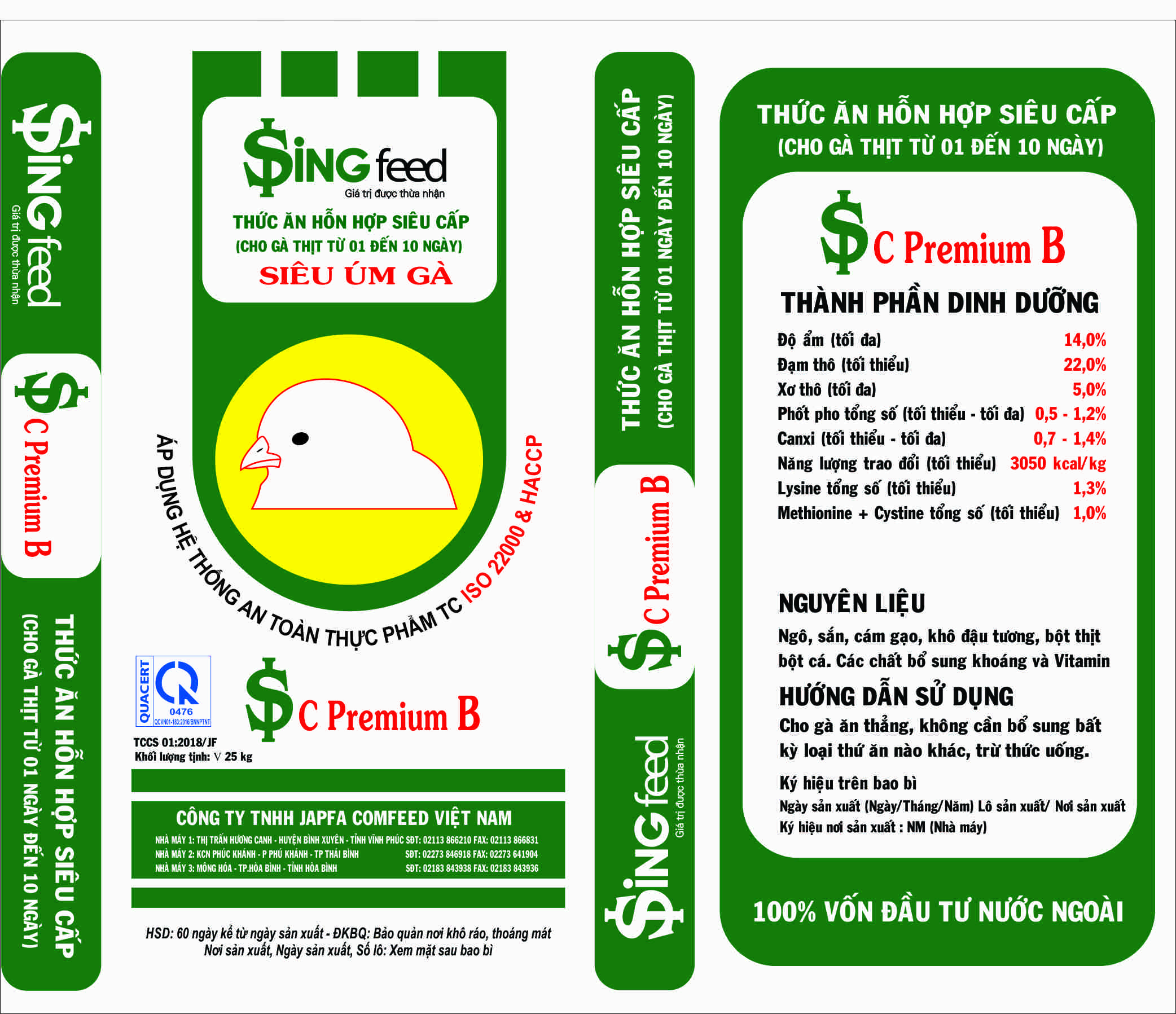 Corn, tapioca, rice bran, soybean meal, meat meal, fish meal, premix and vitamin