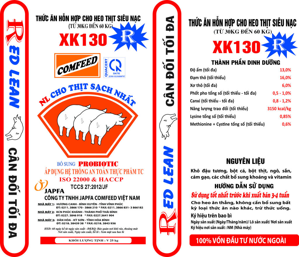 Corn, tapioca, rice bran, soybean meal, meat meal, fish meal, premix and vitamin