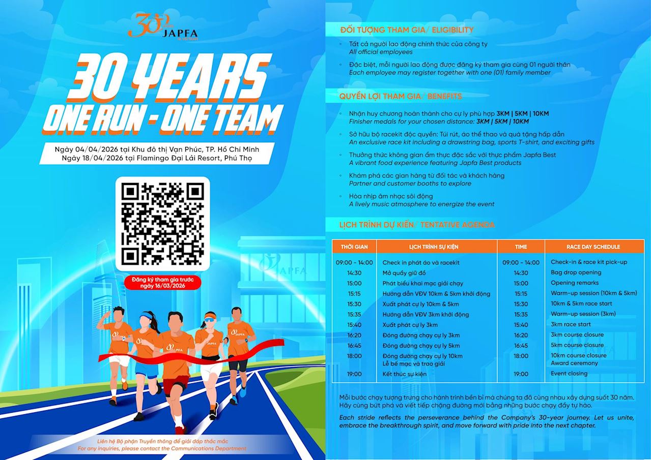 Đánh dấu cột mốc 30 năm phát triển (1996-2026), Công ty tổ chức giải chạy nội bộ “30 Years - One Run, One Team” nhằm gắn kết và lan tỏa tinh thần đồng đội. Đây là sự kiện kết nối nhân sự, người thân, khách hàng và đối tác để cùng nhìn lại hành trình tự hào và bứt phá cho chặng đường phía trước.